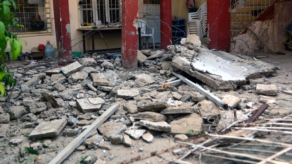 Kendisini halatla damdaki demire bağlayan 4 çocuk babası Deniz, duvar kırma makinesiyle balkonda çalışmaya başladı.