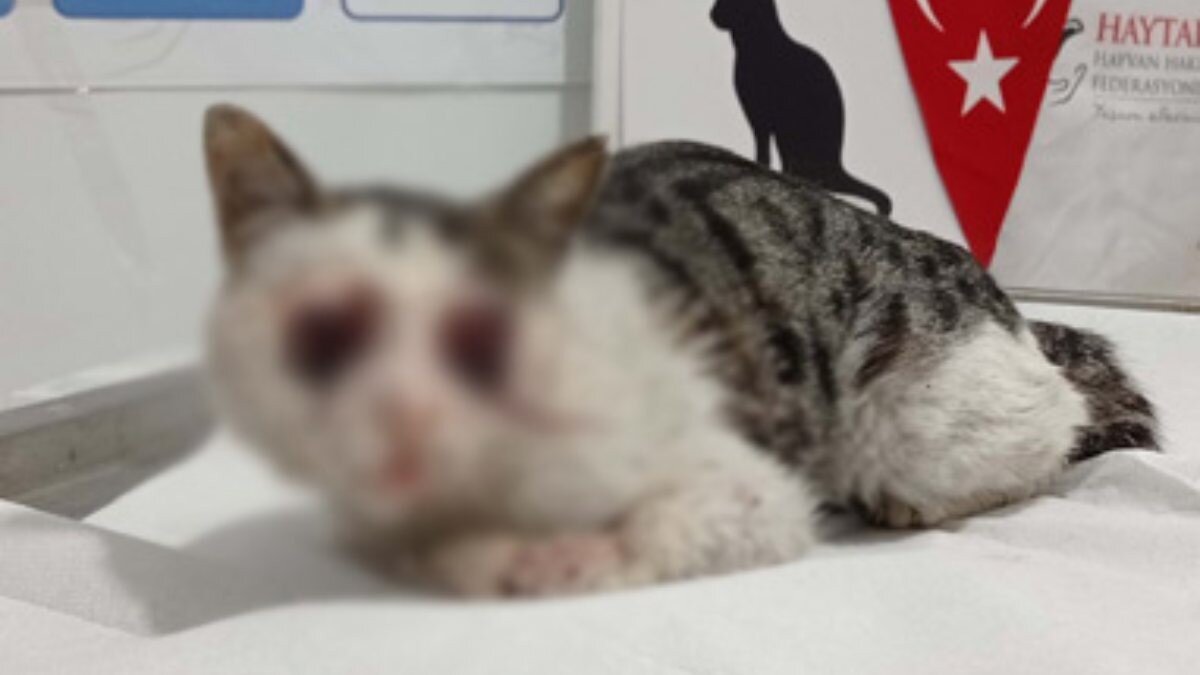 “Enfeksiyondan değil de resmen bir darbe almış. Bu taş olabilir veya küt cisim travması olabilir. İki gözünde de göz küresi tamamen dışarıda ve çok ciddi nekrozlar vardı. Ayrıca kedimiz geldiğinde açlıktan ölmek üzereydi hemen gelir gelmez sıvı takviyesine, mineral takviyesine başladık. Göz kürelerini aldığımız canımızın göz kapaklarına altışar dikiş attık, gözleri mecburen mühürlemek zorunda kaldık. Antibiyotik tedavimiz devam ediyor. Uyuz etkenine de rastladık.”