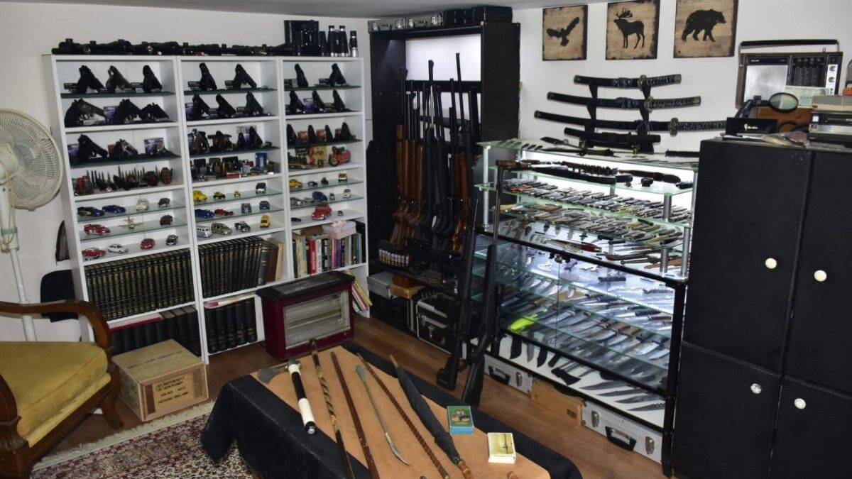 Evdeki aramada 1 el bombası, 27 ruhsatsız tabanca, 8 ruhsatsız av tüfeği, 15 tabanca ve tüfek şarjörü, değişik çaplarda 1560 mermi, samuray kılıcı dahil 106 çeşit kılıç ve bıçak, 1 elektrikli sigara dolum makinesi, 130 kilo kıyılmış tütün, 200 doldurulmuş sigara, 30 bin kaçak makaron ve kaçak sigara paketlemede kullanılan 50 bin kilitli poşet ele geçirildi.