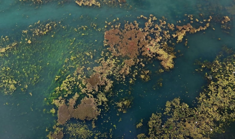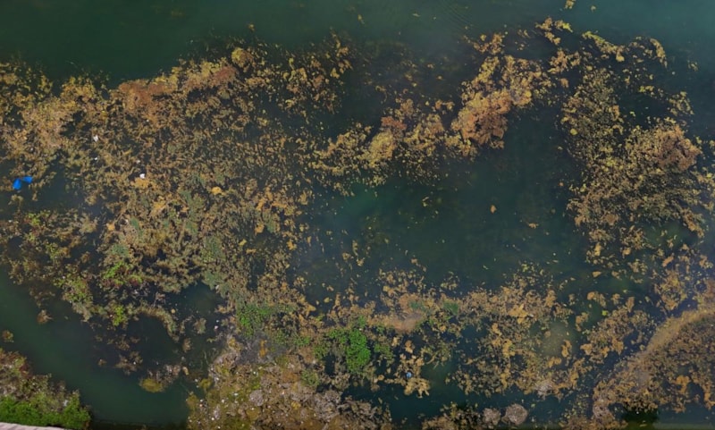 Yosunlar nedeniyle nehrin büyük bir bölümü yeşile büründü.