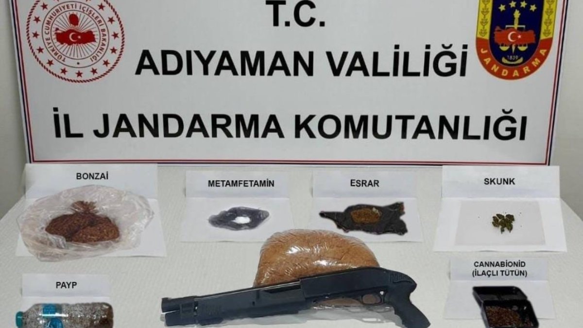 Bu kapsamda da; 2 kilo 485 gram bonzai, 22 gram metamfetamin, 9 gram kubar esrar, 4 gram skunk, 3 adet galara, 4 adet uyuşturucu kullanma aparatı 1 litre 300 ml aseton ve 1 adet ruhsatsız av tüfeği ele geçirildi.