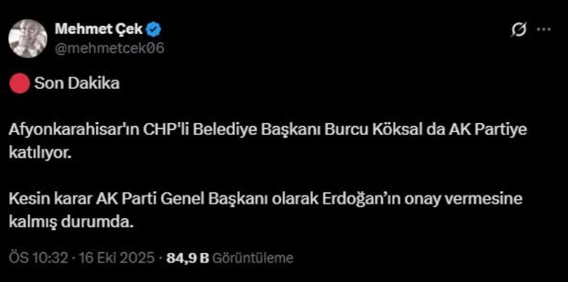 "Afyonkarahisar'ın CHP'li Belediye Başkanı Burcu Köksal da AK Partiye katılıyor. Kesin karar AK Parti Genel Başkanı olarak Erdoğan’ın onay vermesine kalmış durumda."