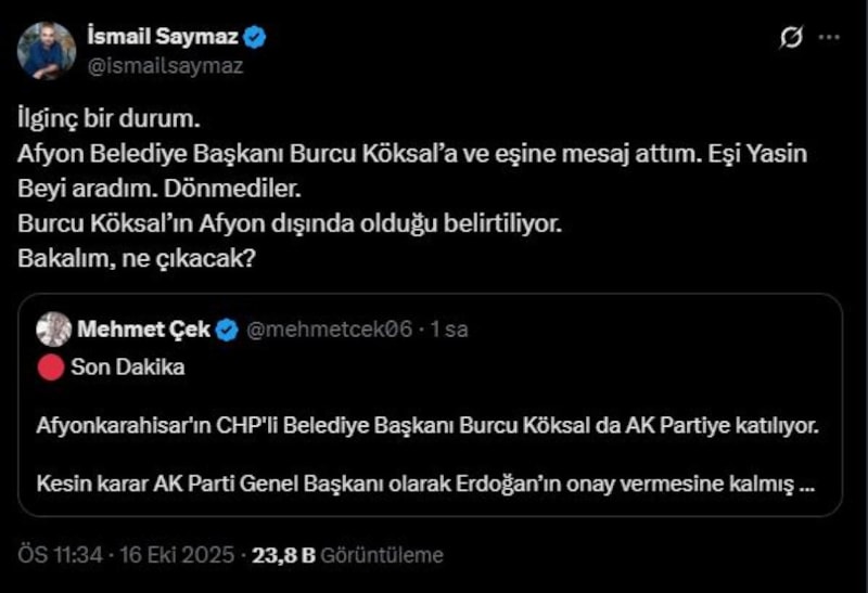 Saymaz, "Afyon Belediye Başkanı Burcu Köksal’a ve eşine mesaj attım. Eşi Yasin Beyi aradım. Dönmediler. Burcu Köksal’ın Afyon dışında olduğu belirtiliyor. Bakalım, ne çıkacak?" paylaşımında bulunarak, iddiaların ciddiyetine dikkat çekti.