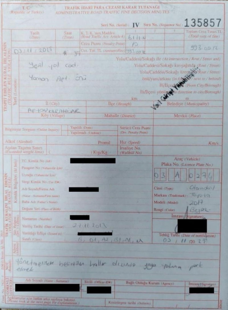 Emniyet müdürlüğü yetkilisi Ahmet Birtan Erol’un talimatıyla araç sürücüsü polis memuruna, 993 TL para cezası yazıldı.