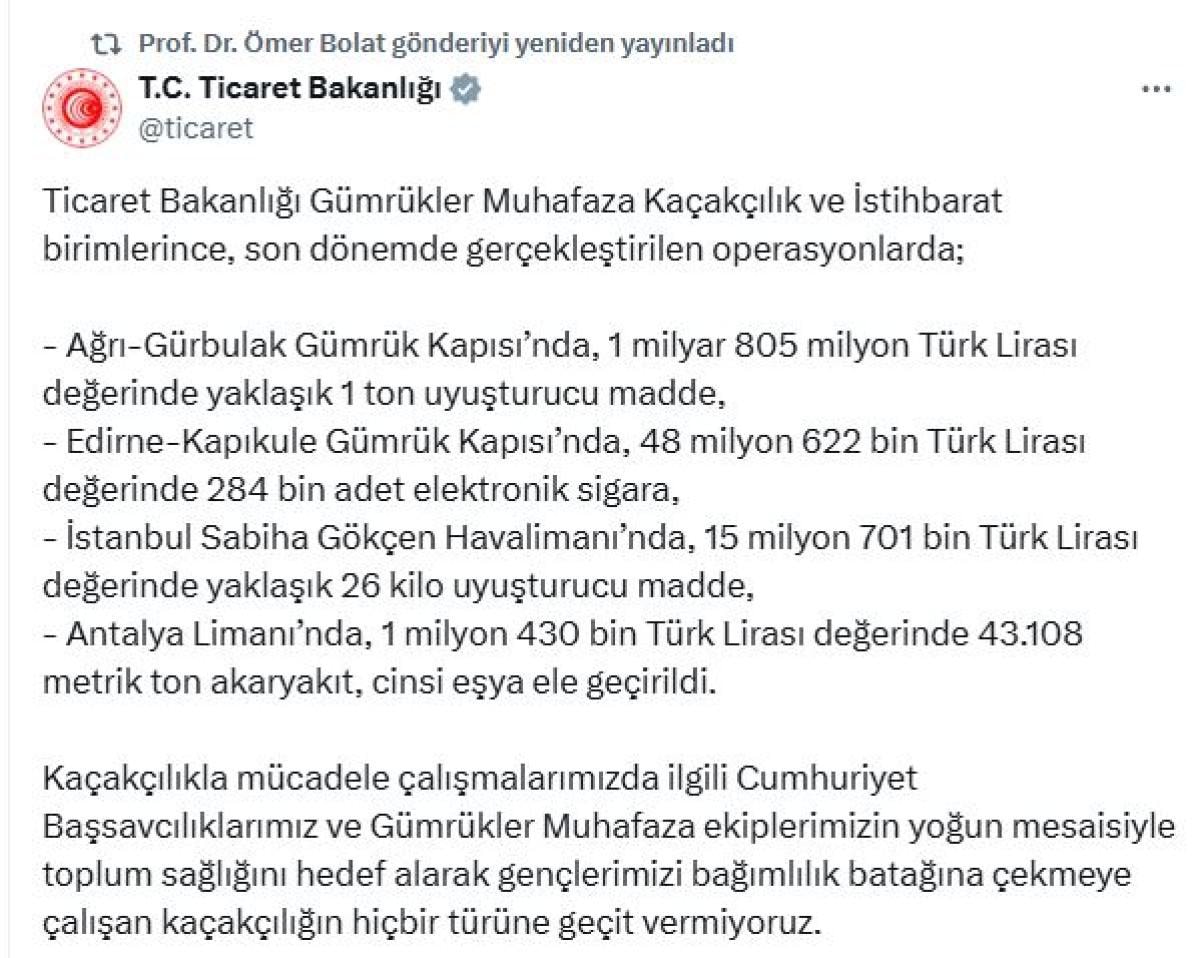 Ticaret Bakanlığı Gümrükler Muhafaza Kaçakçılık ve İstihbarat birimlerince, son dönemde gerçekleştirilen operasyonlarda; Ağrı-Gürbulak Gümrük Kapısı'nda 1 milyar 805 milyon Türk lirası değerinde yaklaşık 1 ton uyuşturucu madde, Edirne-Kapıkule Gümrük Kapısı'nda 48 milyon 622 bin Türk Lirası değerinde 284 bin elektronik sigara, İstanbul Sabiha Gökçen Havalimanı'nda 15 milyon 701 bin Türk Lirası değerinde yaklaşık 26 kilo uyuşturucu madde, Antalya Limanı'nda 1 milyon 430 bin Türk Lirası değerinde 43 bin 108 metrik ton akaryakıt cinsi eşya ele geçirildi" denildi.