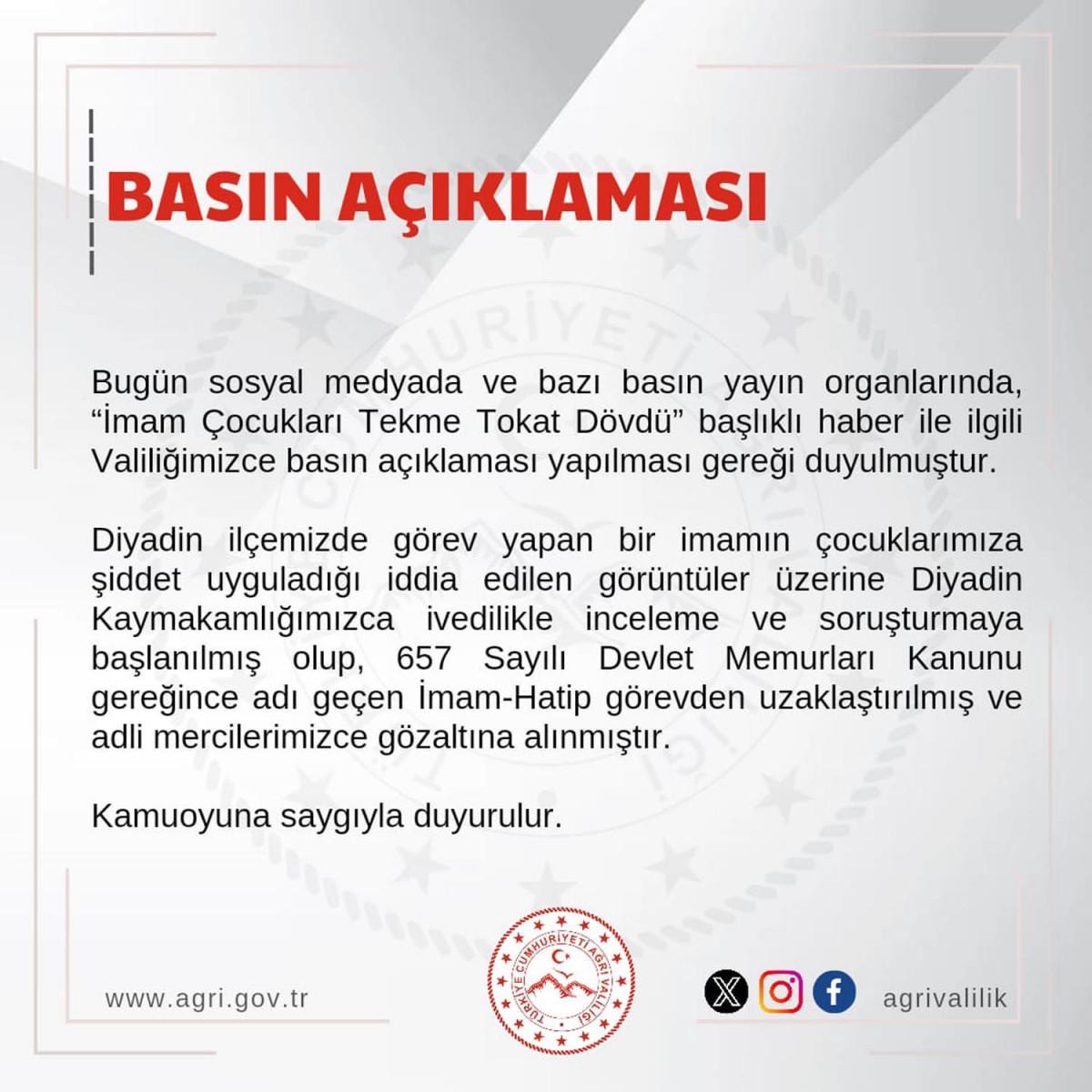 Diyadin ilçemizde görev yapan bir imamın çocuklarımıza şiddet uyguladığı iddia edilen görüntüler üzerine Diyadin Kaymakamlığımızca ivedilikle inceleme ve soruşturmaya başlanılmış olup, 657 Sayılı Devlet Memurları Kanunu gereğince adı geçen İmam-Hatip görevden uzaklaştırılmış ve adli mercilerimizce gözaltına alınmıştır. Kamuoyuna saygıyla duyurulur.