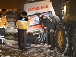 Olay yerine gelen karla mücadele ekipleri, iş makinesine bağlanan halat yardımıyla ambulansı saplandığı yerden çıkardı.