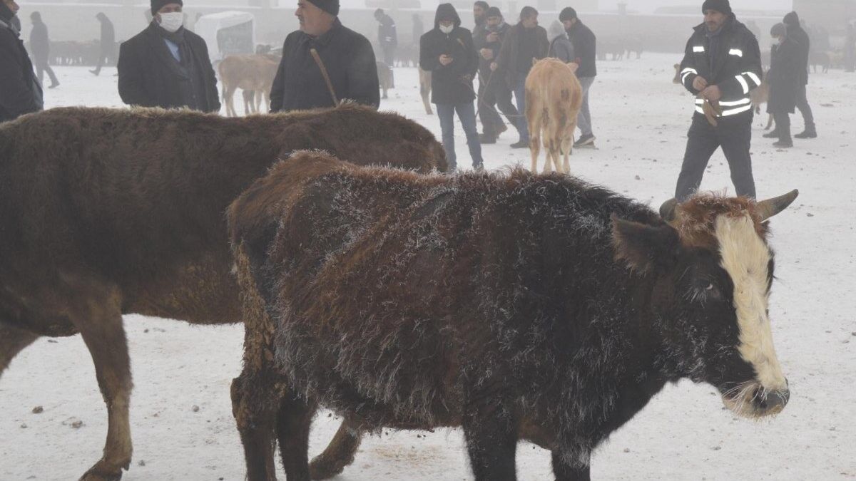 Akarsuların donduğu kentte Ağrı Hayvan Borsası'na getirilen büyükbaş hayvanların tüylerini kırağı kapladı.