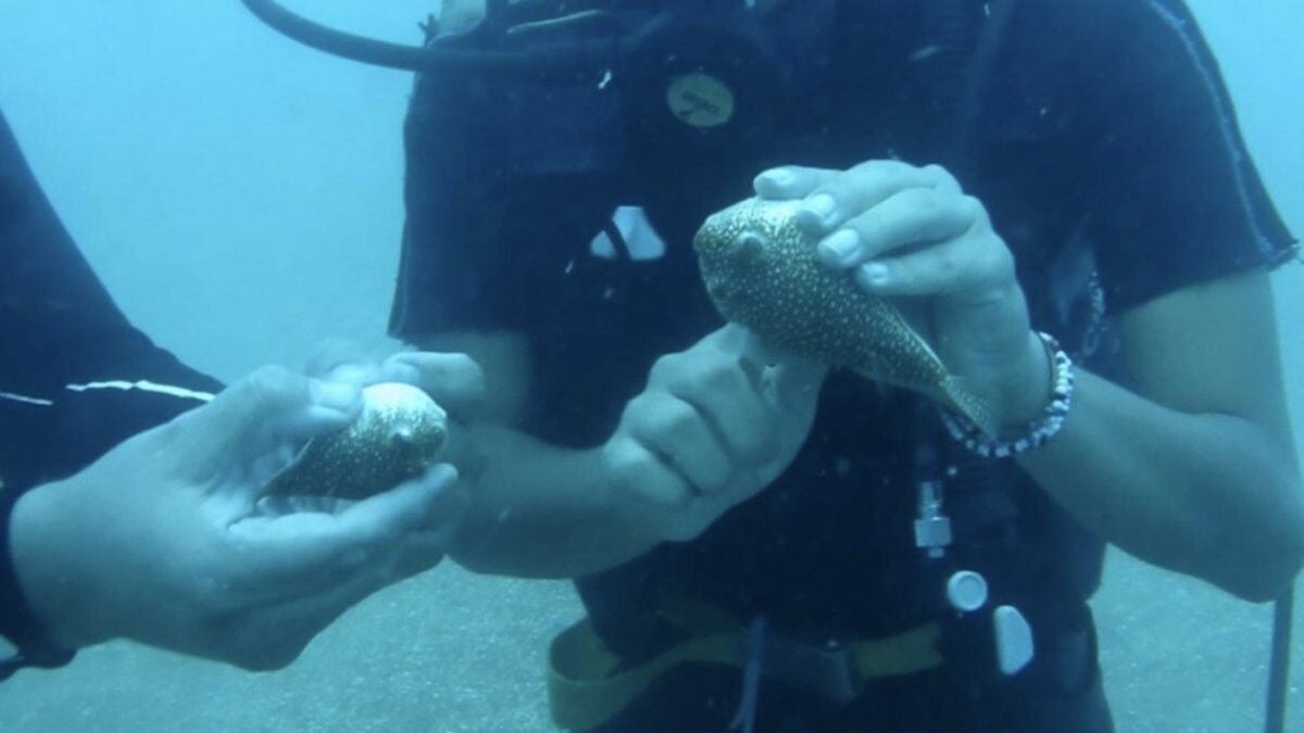 Akdeniz Üniversitesi Su Ürünleri Fakültesi'nden Prof. Dr. Mehmet Gökoğlu ve öğrencileri, yaptıkları dalışta boyutları küçük olduğu için sevimli görünen bir balon balığı türünü görüntüledi. Bu türün, dipteki besinleri paletle havalandıran dalgıçları takip ettiği görüldü.