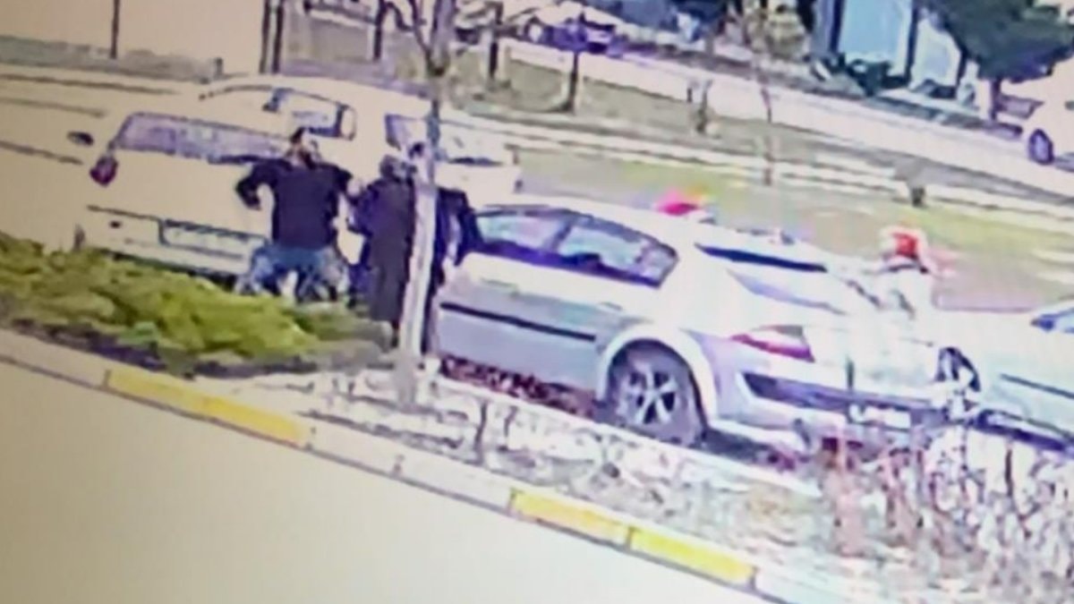 Görüntülerde şahsın araçla borçlu olan kişinin aracının önünü kestiği, aşağıya inip yumrukla saldırdığı ve karşı tarafın bıçaklama anı yer alıyor.