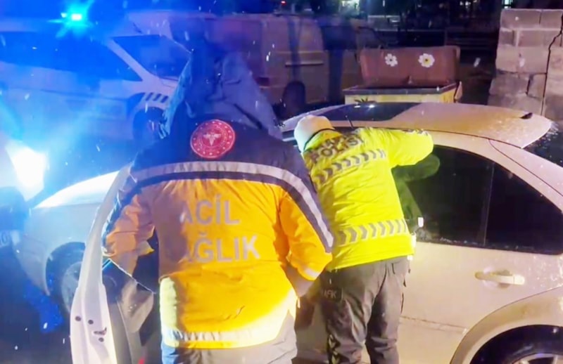 Aldığı alkolün etkisiyle yürümekte zorlanan sürücü, polis memurunun kolunda ambulansa götürüldü.