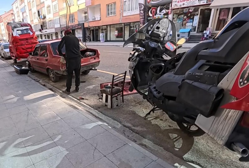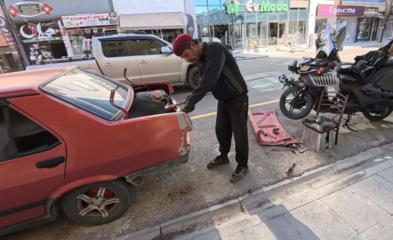 Caddeyi adeta sanayi dükkanına çevirip araç kaporta tamiri yapan ve gürültü nedeniyle polise bildirilen şahıs, kendisini uyarmaya gelen polislere, "Bu vatandaşlar nasıl bir vatandaş. 10 litre benzin, 150 gram yanık yağ var. Ahtım var benzin döküp cayır cayır yakacağım" yanıtını verdi.