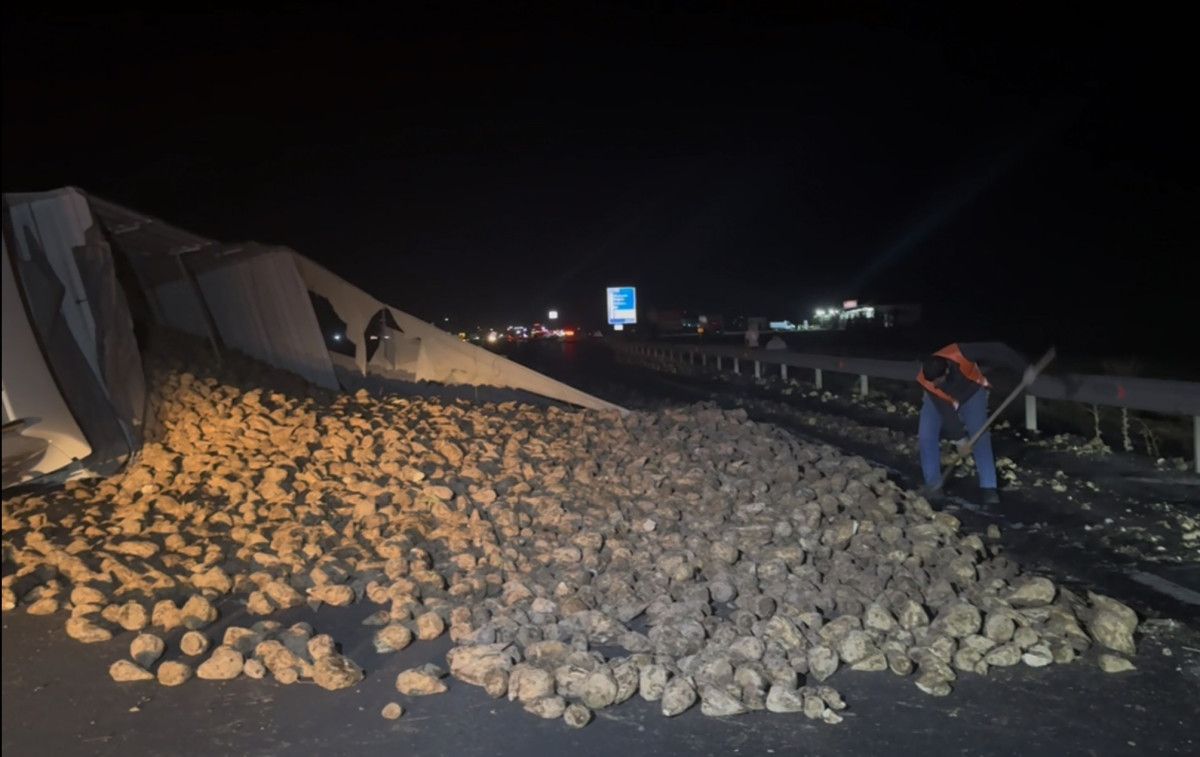 Devrilen tırın dorsesindeki pancarların dökülmesiyle yol trafiğe kapandı.