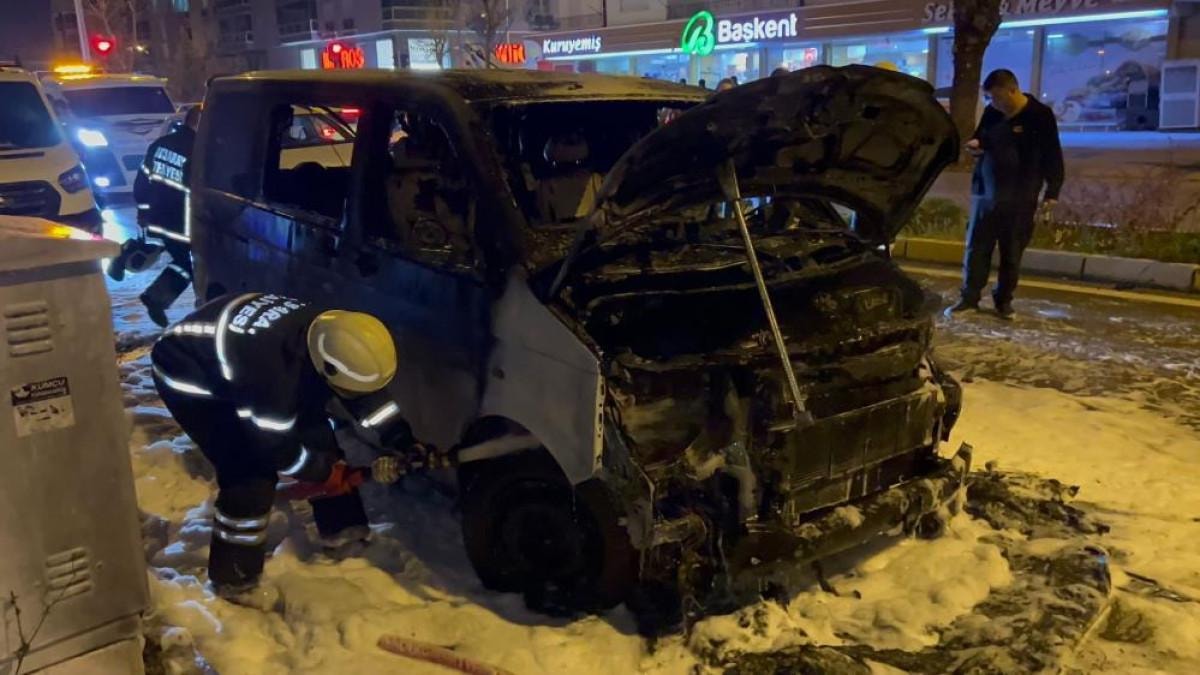 Minibüs adeta alev topuna dönerken sürücünün ihbarı üzerine olay yerine polis ve itfaiye ekipleri sevk edildi.