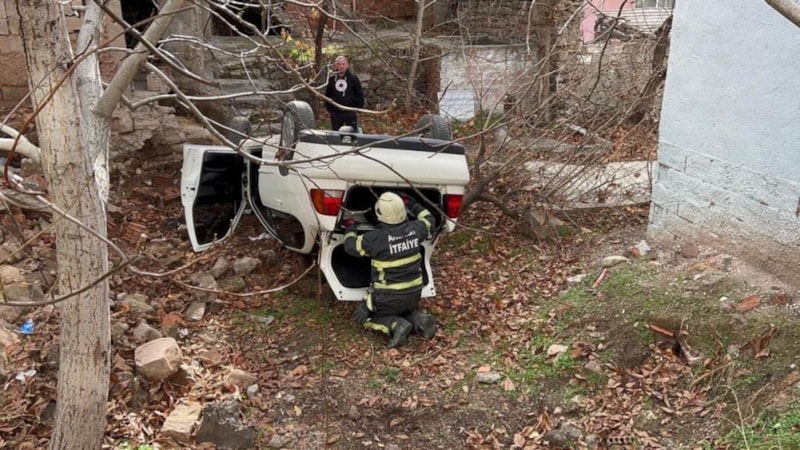 Kaza sonucu bir evin bahçesine düşen otomobil hurdaya dönerken, sürücü kazayı burnu dahi kanamadan atlattı.