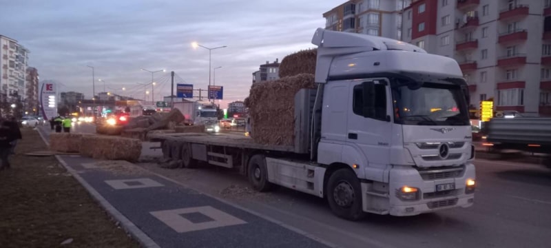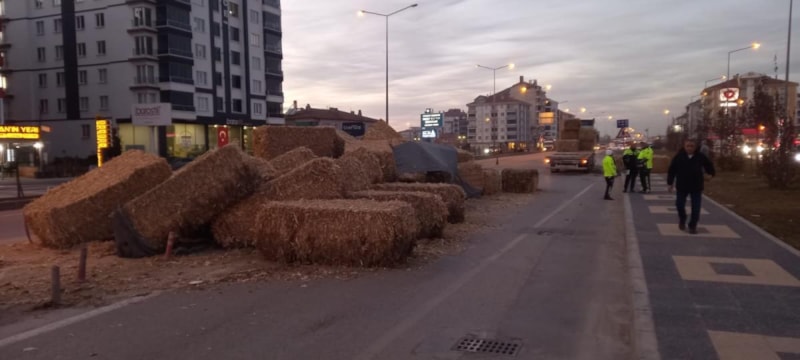 Tırın dorsesinde yüklü yonca balyalarının devrildiği ve yola savrulduğu anlar, başka bir aracın kamerasına yansıdı.