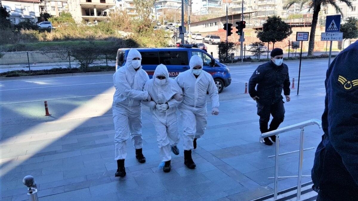Jandarma ekipleri, koruyucu elbiseler içerisinde şahsı adliyeye sevk etti.