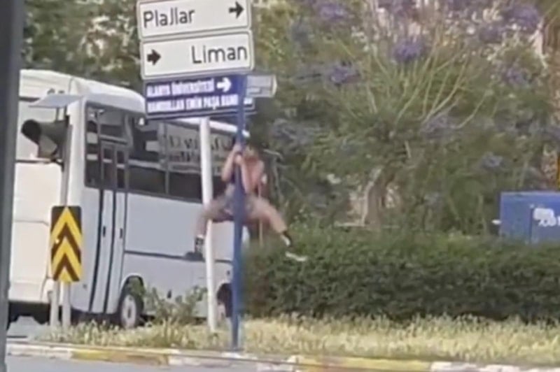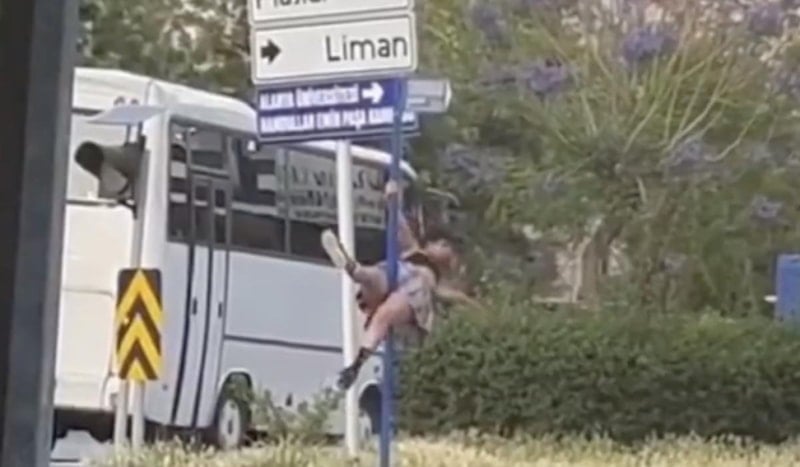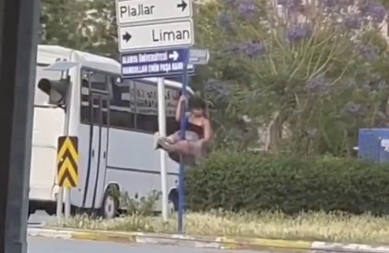 Alanya'da bir kadın, sokak ortasında bulunan yön levhasında direk dansı yaparken görüntülendi...