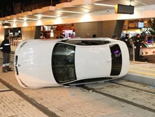 Kaza nedeniyle tramvay seferleri yaklaşık 1 saat yapılamazken, otomobilin çekilmesiyle seferler normale döndü.