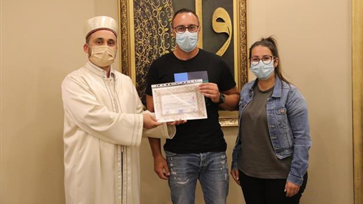 İzci, Deniz Patrick'e ihtida belgesi, Almanca Kur'an-ı Kerim meali ve İslam dinini anlatan kitap seti hediye etti.