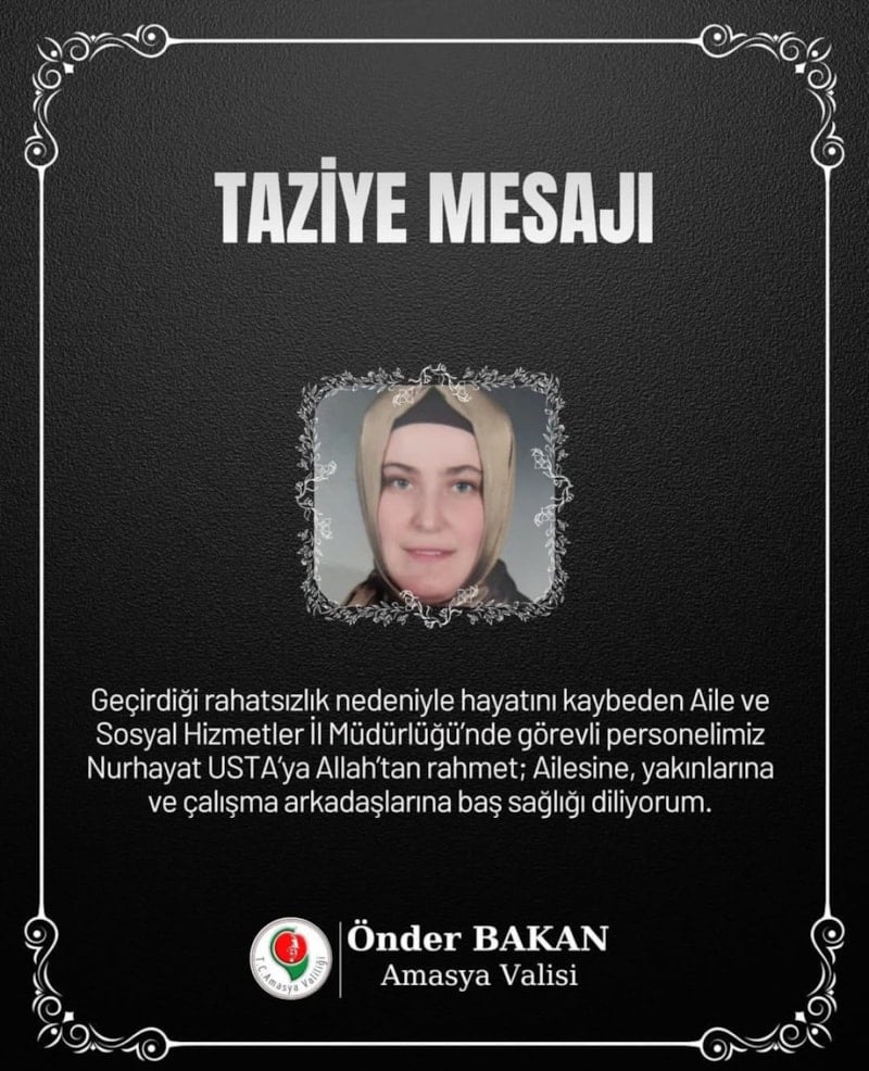 Taziye mesajı yayımlayan Vali Önder Bakan, “Geçirdiği rahatsızlık nedeniyle hayatını kaybeden Aile ve Sosyal Hizmetler Müdürlüğü’nde görevli personelimiz Nurhayat Usta’ya Allah’tan rahmet, ailesine, yakınlarına ve çalışma arkadaşlarına başsağlığı diliyorum” ifadelerini kullandı.