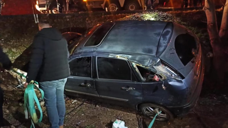 5 metre yükseklikten bahçeye düşüp, ağaca çarpan otomobilin 5 aylık hamile sürücüsü Seren Dinçer Gevrek, hafif yaralanarak hastaneye kaldırıldı.