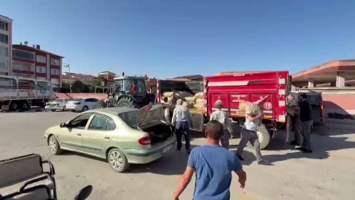 Sergen Doğan'ın köyünden traktörle Suluova ilçe merkezine getirdiği bir römork dolusu patates çuvalları, kısa sürede kapış kapış dağıldı.