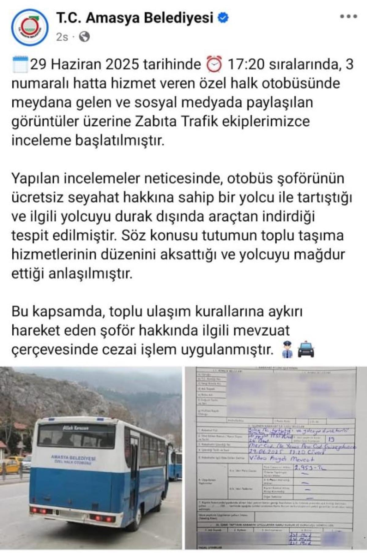 Şoförün, engelli yolcuyu araçtan indirdiği anların sosyal medyada paylaşılması sonrası Amasya Belediyesi zabıta ekipleri devreye girdi. Yapılan inceleme sonucunda, engelli yolcunun ücretsiz seyahat hakkının ihlal edildiği ve şoförün toplu ulaşım kurallarını çiğnediği belirlendi.