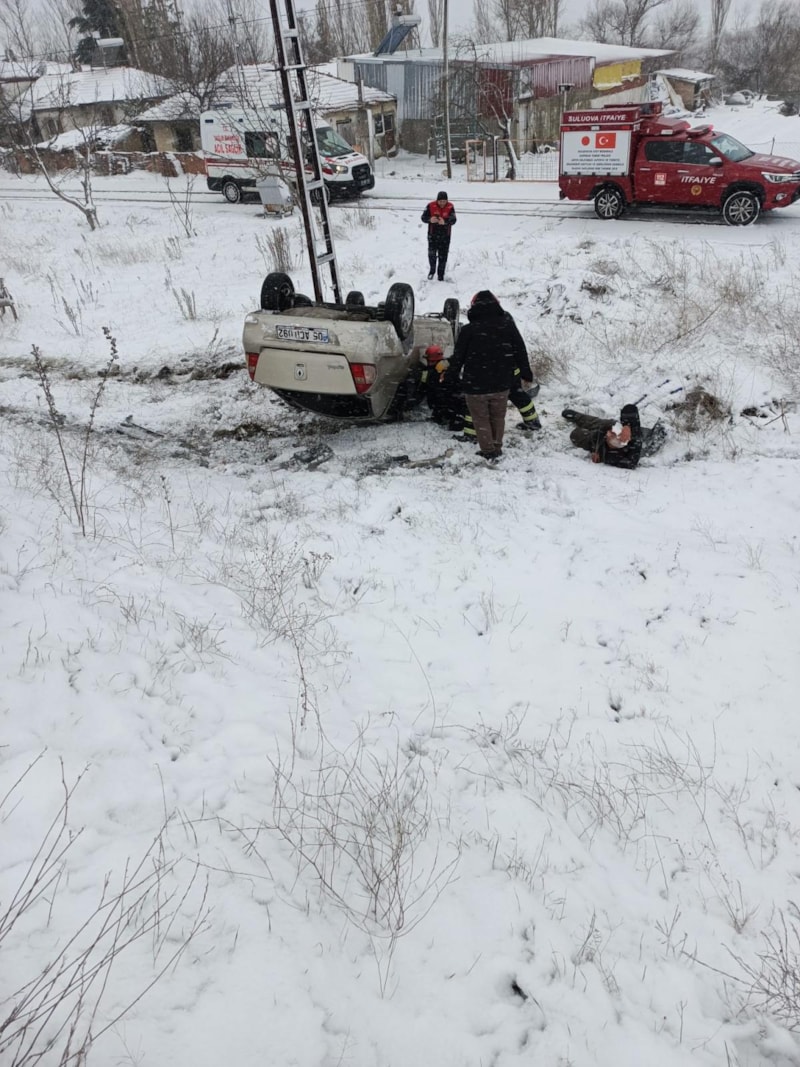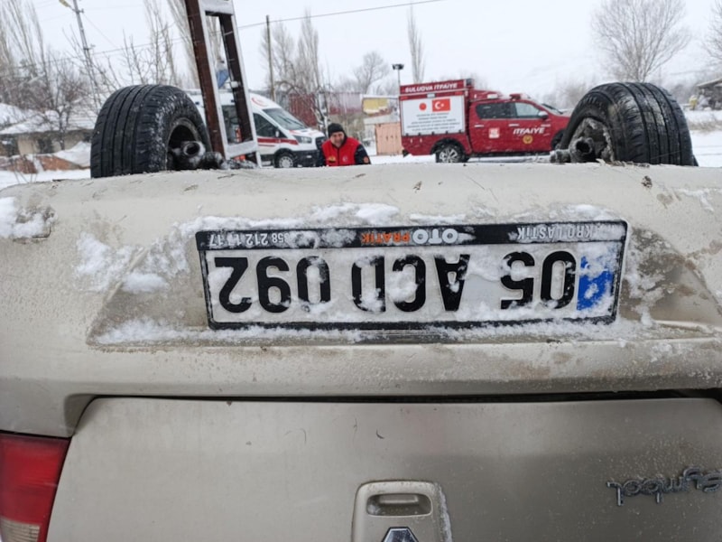 Karlı yolda kayıp kontrolden çıkan otomobil, şarampole devrildi.