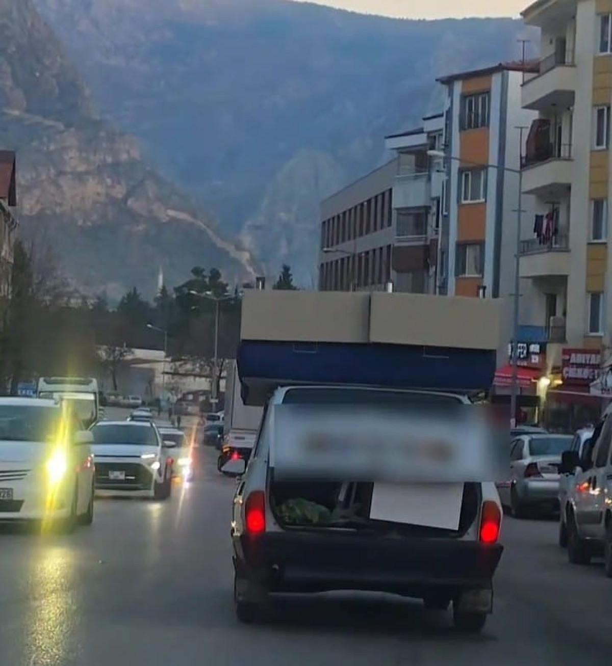 Amasya merkez Şeyhcui Mahallesi'nde otomobilinin tavanında çift kişilik baza ve yatak taşıyan sürücü, tehlikeye aldırış etmeden trafikte ilerledi.