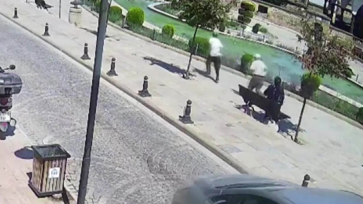 Bankaya yakın meydanda dolandırıcının kendisini fark eden bir adamdan kaçtığı anlar, kameraya yansıdı.