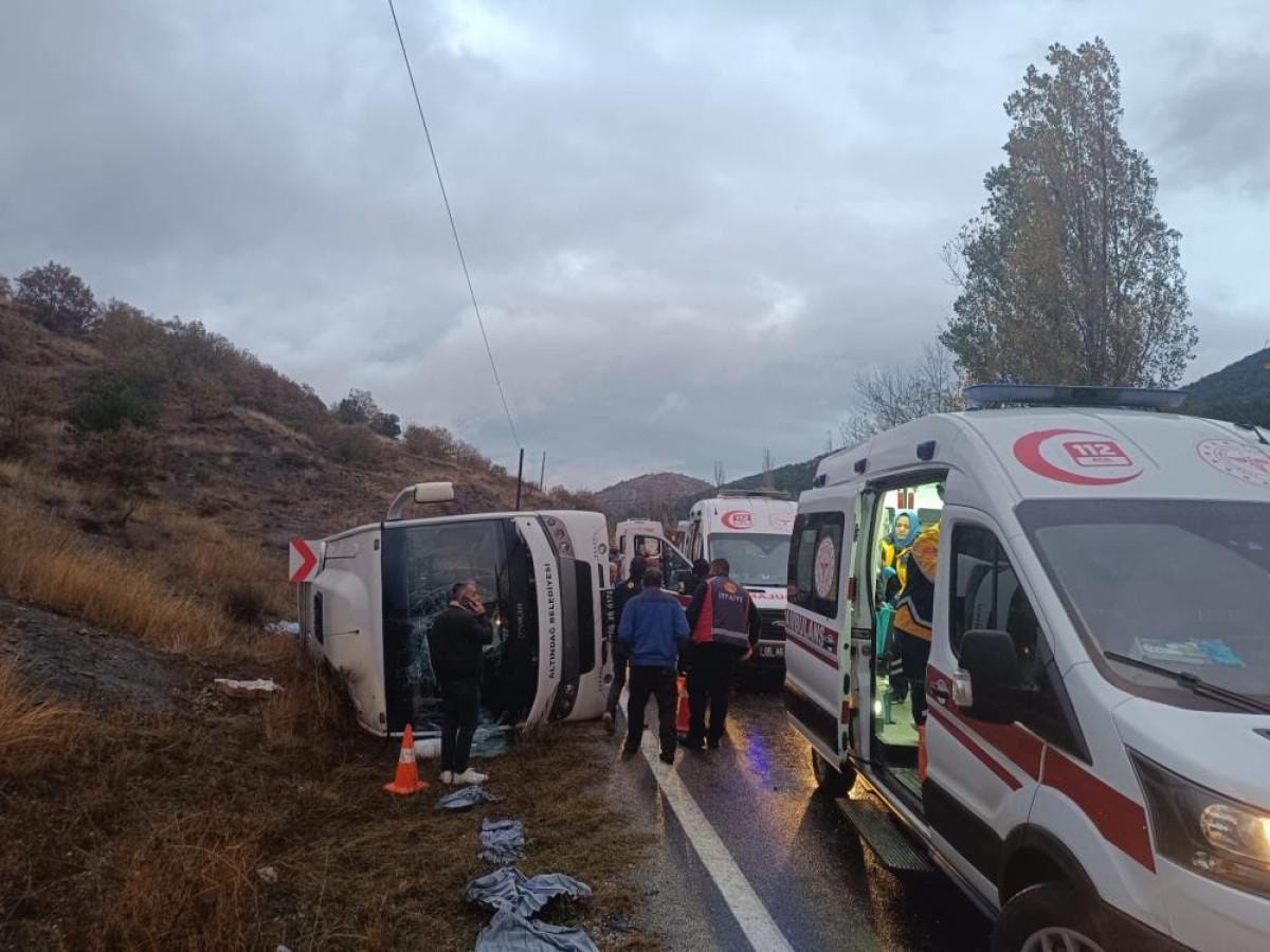 Ankara'dan cenaze için ilçemize gelen yolcu otobüsü, yağışında etkisiyle devrilmiş. İçinde 33 yolcumuz vardı, şükrediyoruz içinde ağır bir yaralımız yok. Yaralılarımız hastanede tedavi altına alındılar, hepimize geçmiş olsun.