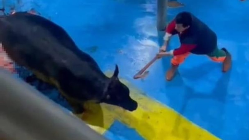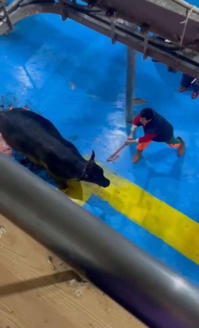 Tesise kesilmek üzere getirilen büyükbaş hayvana bıçak ve baltayla eziyet edildiği ortaya çıktı.