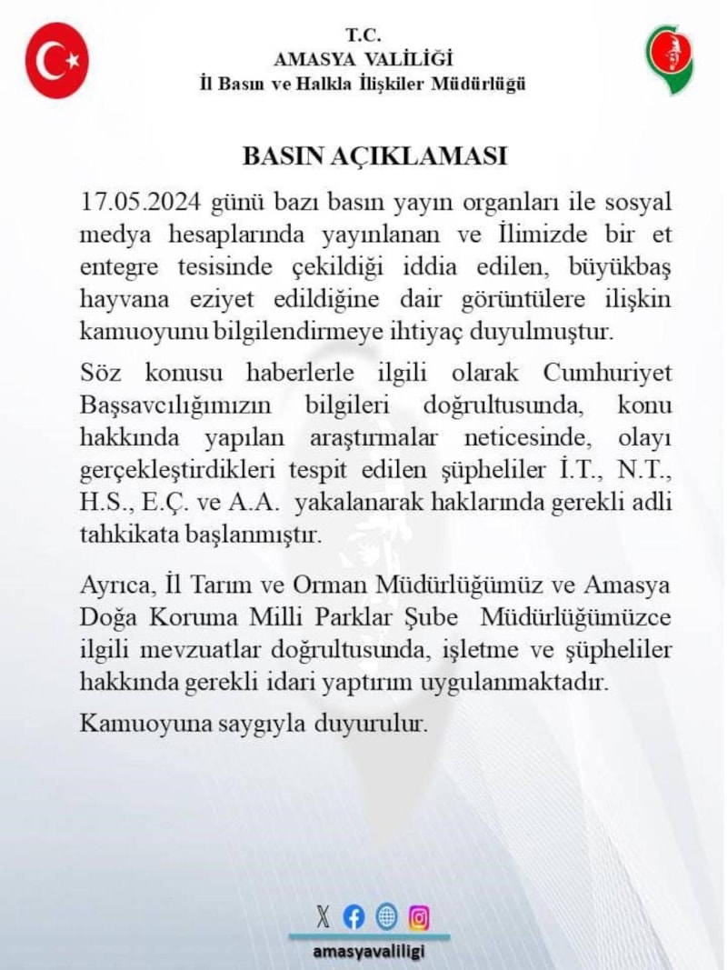 Amasya Valiliği’nden yapılan açıklamada, “17 Mayıs 2024 günü bazı basın yayın organları ile sosyal medya hesaplarında yayınlanan ve ilimizde bir et entegre tesisinde çekildiği iddia edilen, büyükbaş hayvana eziyet edildiğine dair görüntülere ilişkin kamuoyunu bilgilendirmeye ihtiyaç duyulmuştur.