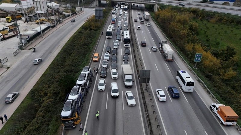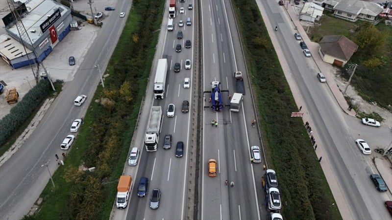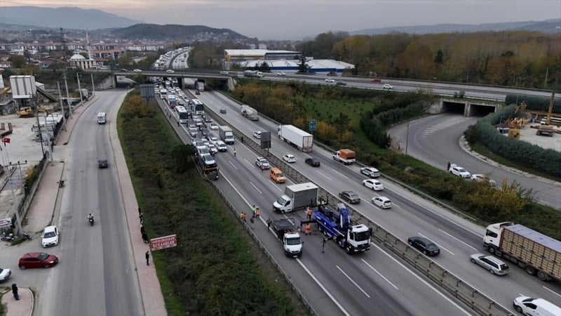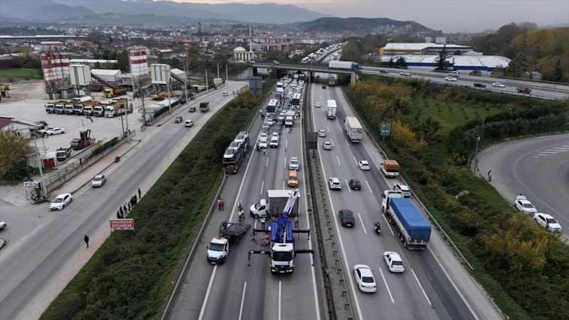 Anadolu Otoyolu Sakarya geçişinde SUV tarzı araç yüklü tır ile çarpışan nakliyat kamyoneti devrildi. Kazada yaralanan olmazken, otoyolun Ankara istikametinde kilometrelerce araç kuyruğu oluştu.