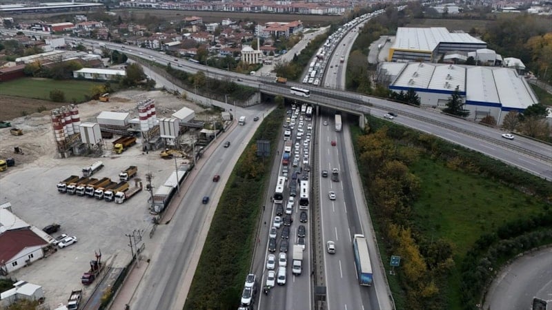 Kamyonetin bulunduğu yerden kaldırılmasıyla trafik normale dönerken, olay sırasında yolda oluşan araç kuyruğu havadan görüntülendi.