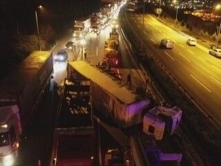 Devrilen tır nedeniyle ulaşım bir süreliğine tek şeritten sağlanırken, Ankara istikametinde uzun araç kuyrukları oluştu.