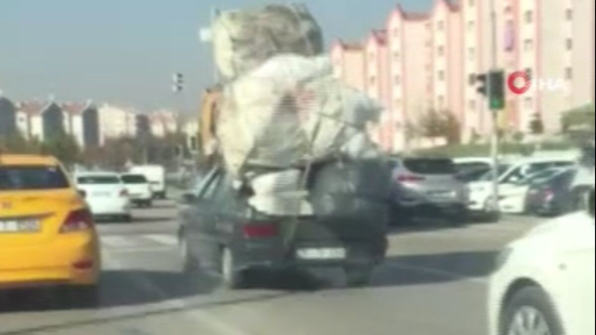 Trafikteki diğer insanların güvenliğini hiçe sayan sürücünün adeta bir kamyon yükü kadar yük yüklediği araç, vatandaşlar tarafından görüntülendi.