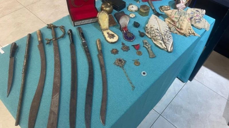 Ele geçirilen objeler arasında 19. ve 20. yüzyıl Osmanlı dönemine ait yaklaşık 200 yıllık kapıkulu sipahilerin kullandığı bir adet çakmaklı piştov silah, 1918'de Sultan Vahdettin tarafından dönemin Osmanlı teğmenlerine gönderilen berat-ı şerif, Kurtuluş Savaşı sonrası üstün başarı gösteren askerlere verilen İstiklal Madalyası, Sultan Abdülmecid tarafından devlet kademelerinde üst düzey başarı gösteren devlet bürokratlarına verilen 4 adet mecidiye nişanı, yeniçeriler tarafından savaş meydanlarında yakın ve uzak muharebe esnasında kullanılan kılıç, kama, kını ve yatağan yer aldı.