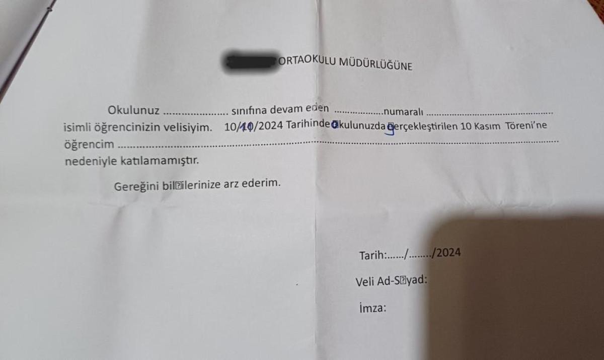 Konuyla ilgili sosyal medya hesabından açıklamada bulunan veli Polat, “Oğulcan'ım grip nedeniyle doktora gitti, 8-9 Kasım tarihleri için rapor verildi. Okul 10 Kasım'da anma töreni yapmış. Dün okul yönetimi oğlumla konuşmuş. Bugün de tarafıma bu evrak gönderildi.” ifadelerine yer verdi.