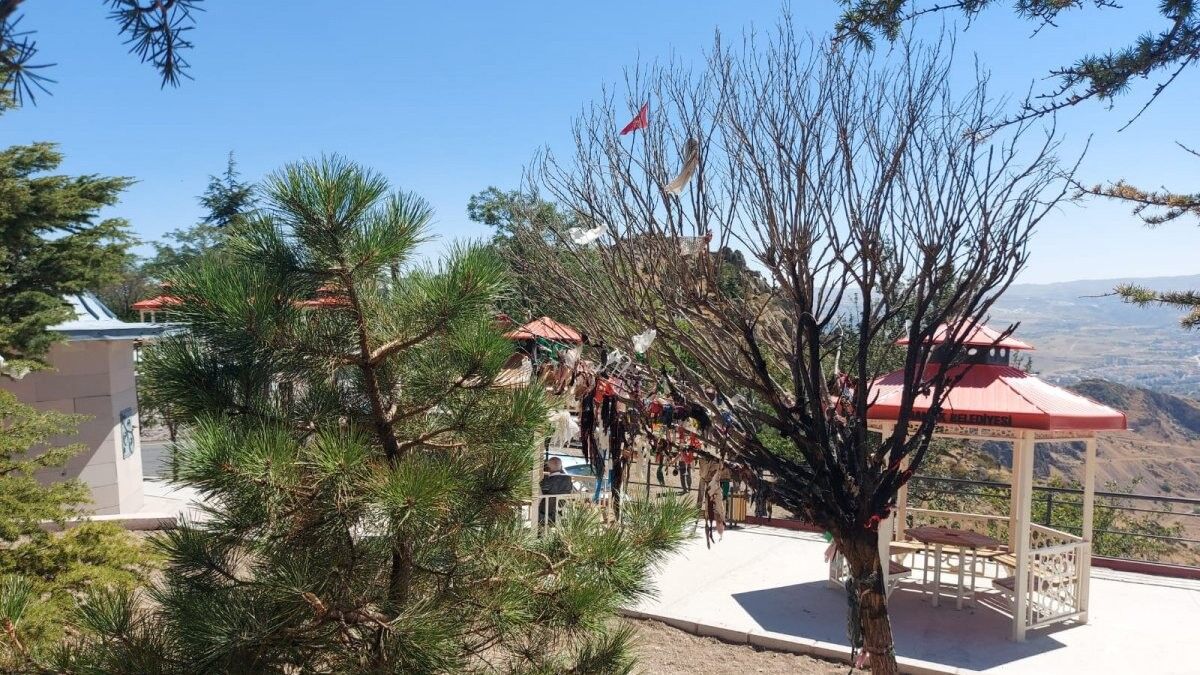 Otomobille cemevine gelen 2 kişiden biri araçtan inip, bez bağlama bahanesiyle yanına yaklaştığı dilek ağacını ateşe verdi.