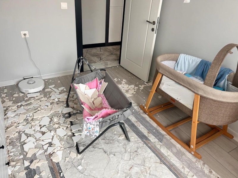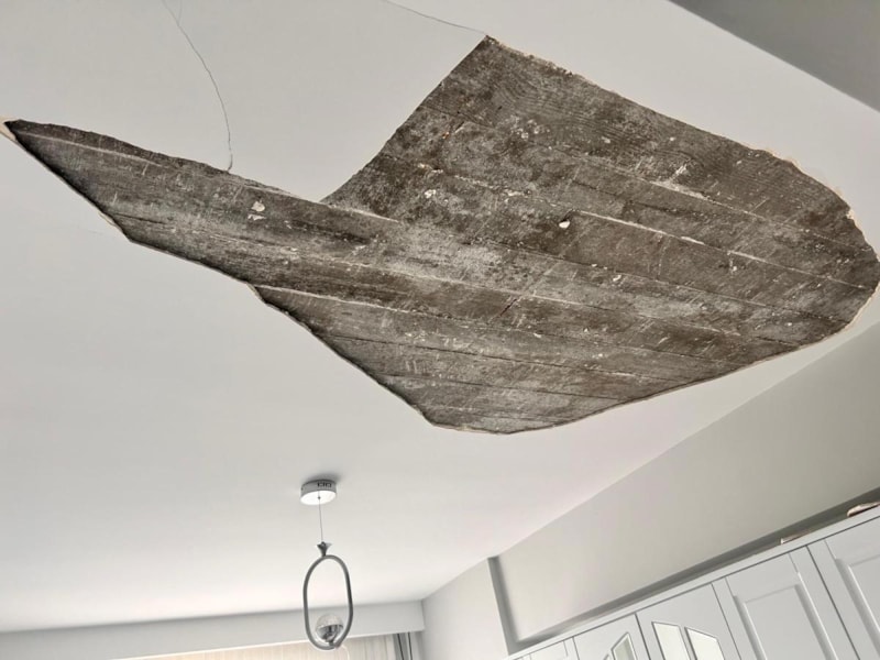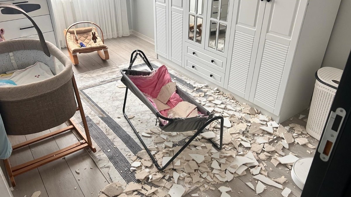 Aslan'ın bebeğini evin içinde dolaştırdığı esnada bebek odasındaki tavandan kopan parçalar, beşiğin üstüne düştü.