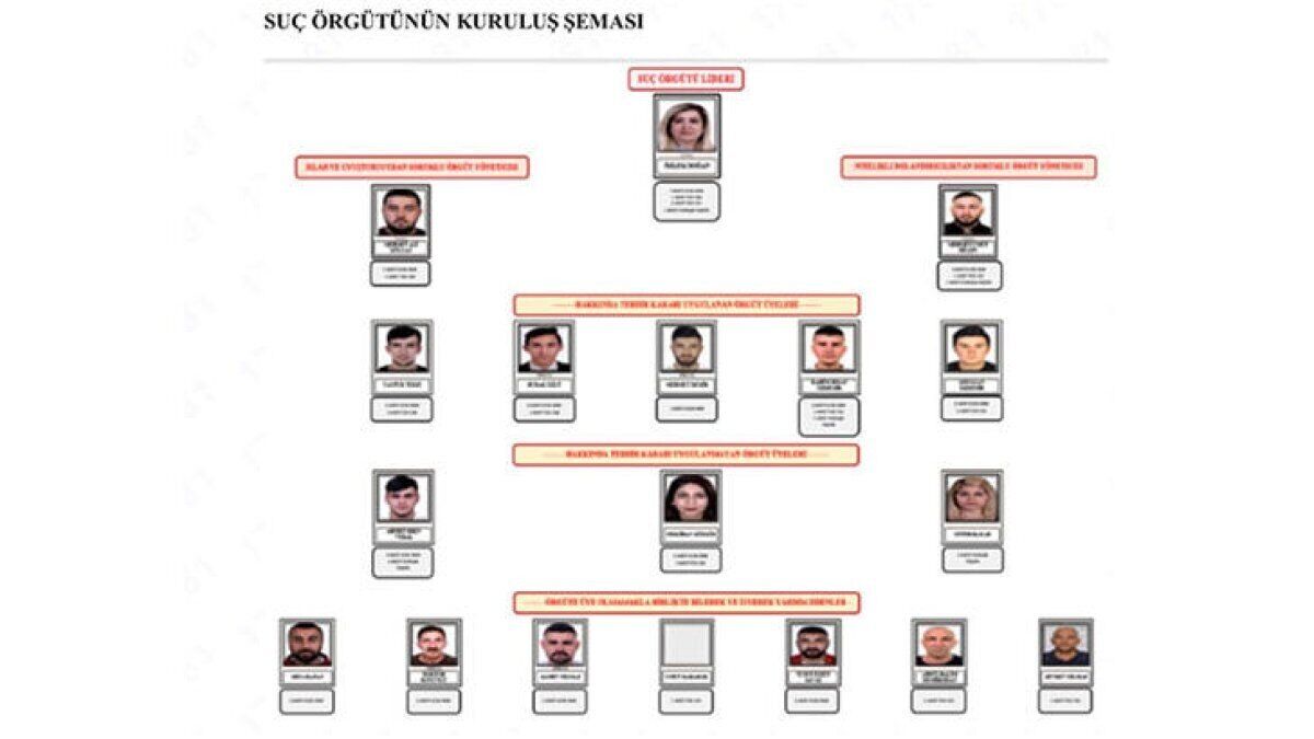 İddianamede, örgütün liderliğini başka suçtan tutuklu Özlem D.’nin yaptığı, suç örgütünün uyuşturucu ve silah ticareti kanadının yöneticisinin Mehmet Ali G., fuhuş vaadiyle dolandırıcılık kanadını yönetenin ise Ahmet Eren V. olduğu belirtildi.
