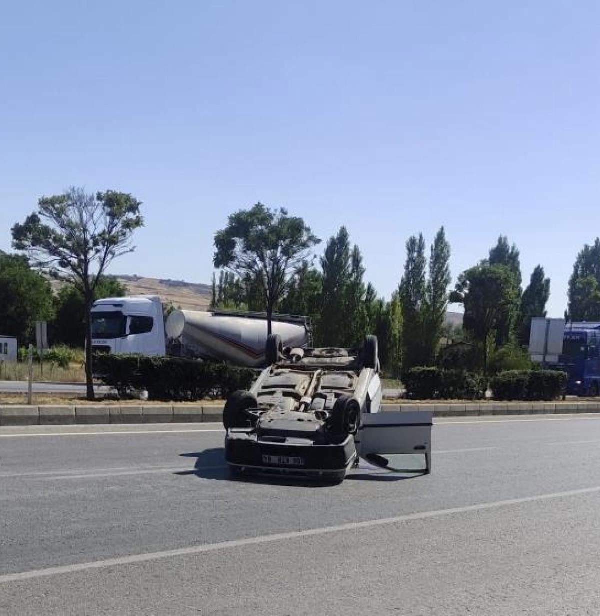 Çarpmanın etkisiyle araç takla atarak yolda tepetaklak oldu.
