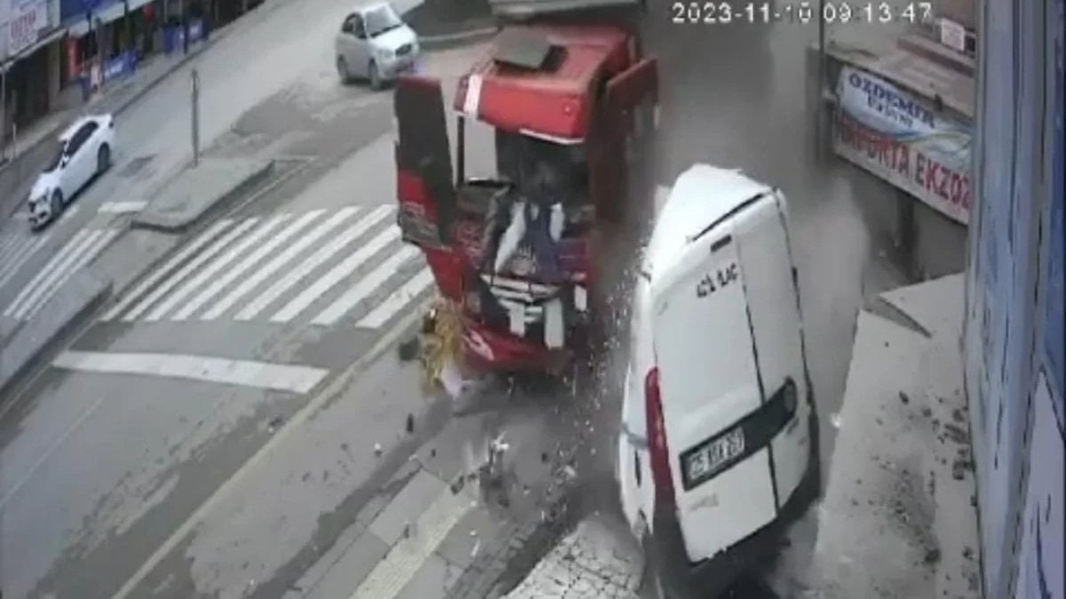 Ankara'nın Mamak ilçesine bağlı Yeşilbayır Mahallesi Sağduyu Caddesi'nde freni boşalan mandalina yüklü kamyon, döner kavşakta yolun karşısına geçip hafif ticari araca çarptı.