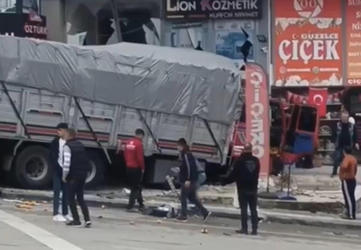 Kamyon, ticari aracı önünde sürükleyerek, caddedeki kozmetik mağazasına girdi.