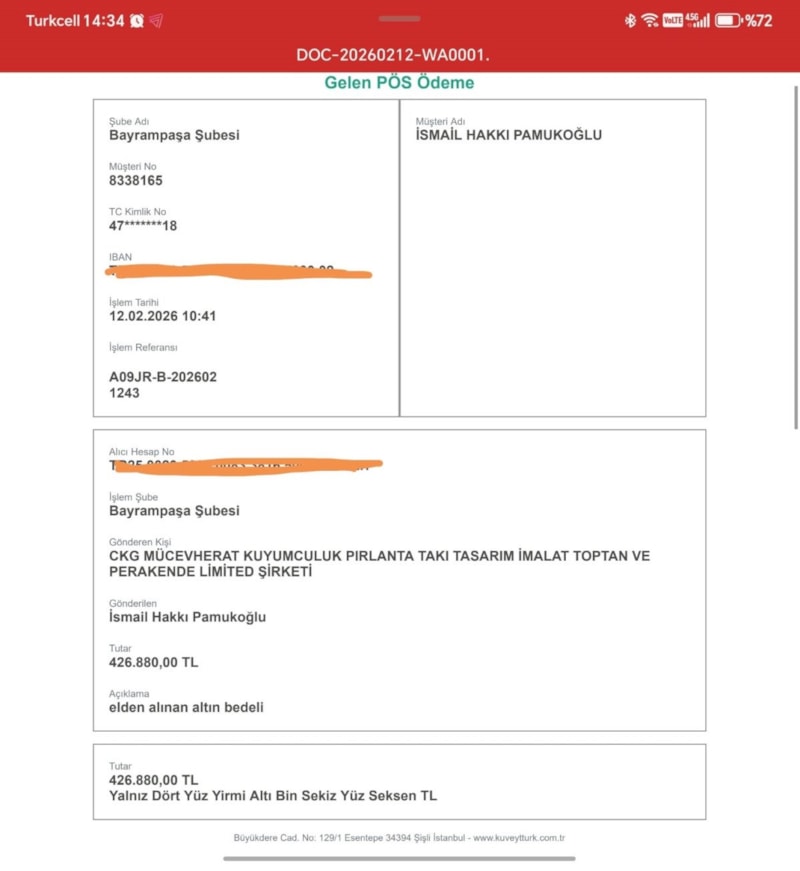 Saat 10.40'ta hesabına 426 bin lira yattığını kaydeden Pamukoğlu, "Büyük ihtimalle bir altın alışverişinden dolayı yanlış birinin hesabına gittiğini düşündüm. Şu ana kadar ki kanım buydu ama kuyumcunun bunu inkar etmesi bambaşka bir boyuta taşıdı olayı." dedi.
