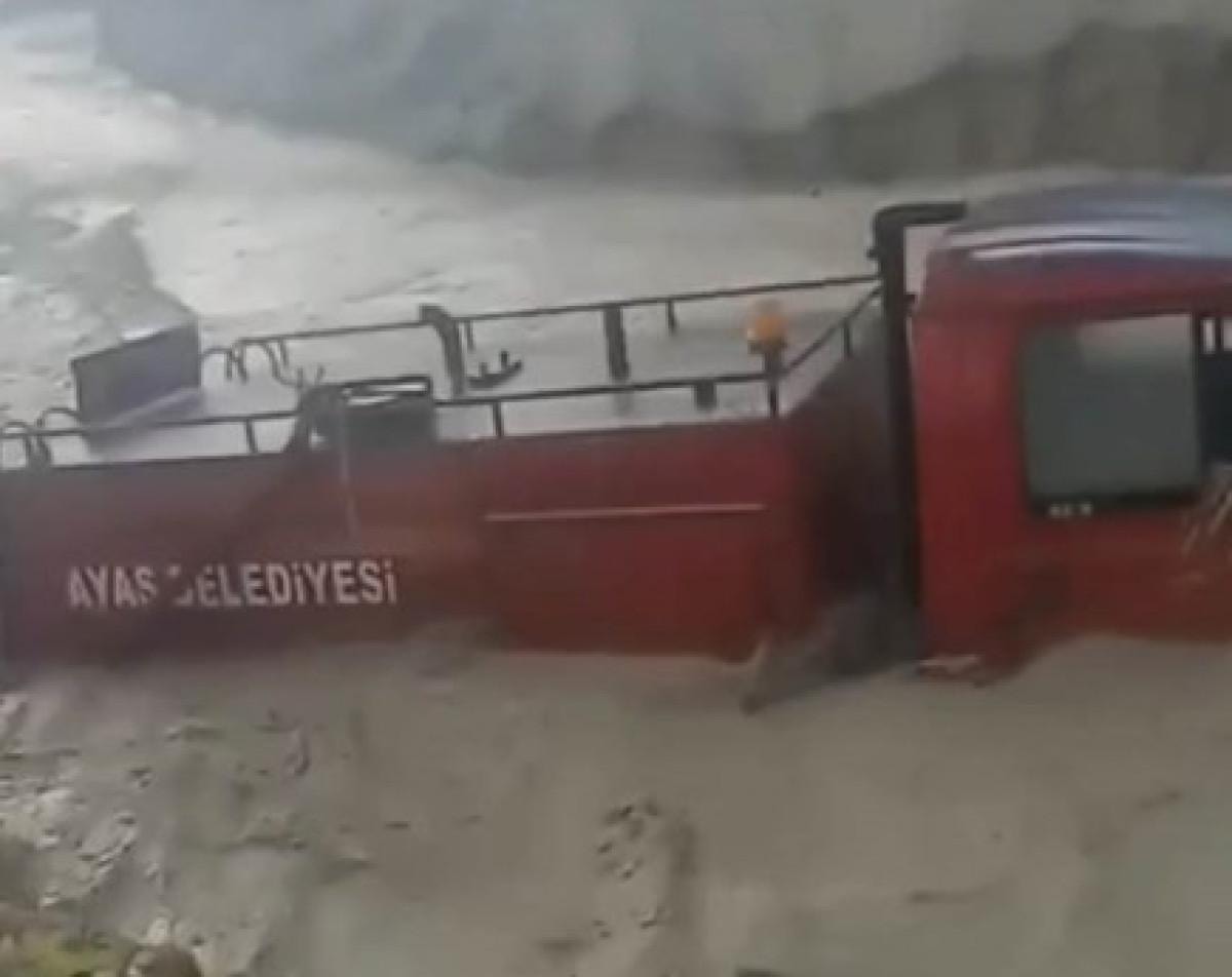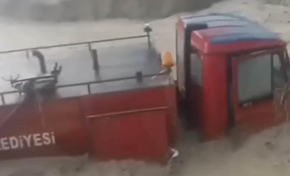 Bu sırada, taşan dereyi aşmaya çalışan itfaiyeye ait bir kamyon sele kapıldı. Araçta bulunan şoför Macit Kömürcü ve beraberindeki belediye personeli, son anda araçtan atlayarak canlarını kurtardı.