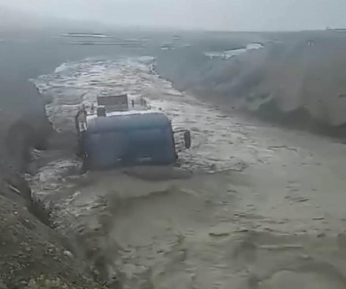 Suyun sürüklediği kamyon, bölgeye yönlendirilen ekipler tarafından güçlükle çıkarıldı.