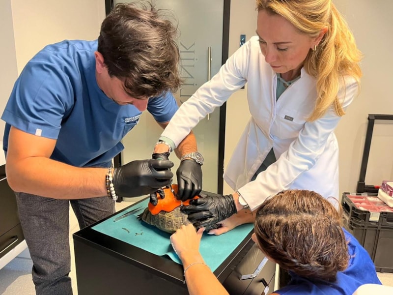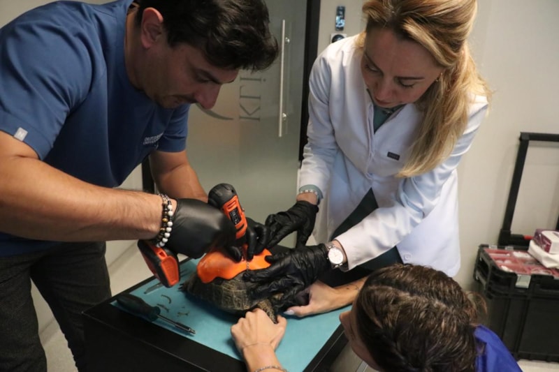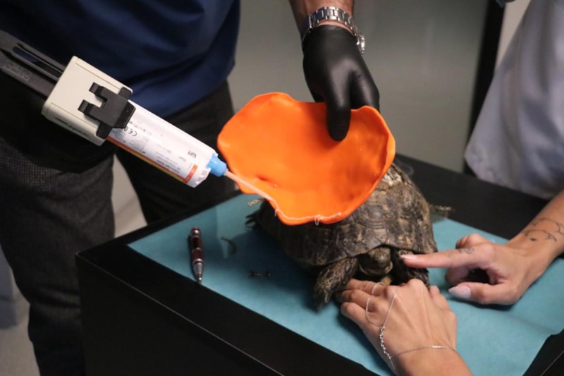 Diş Hekimi Serdar Akdeniz ise, "Kaplumbağanın kabuğunda büyük kırıklar vardı. Geleneksel akrilikle yapılan yapışkanlarla yaptığımız zaman çok başarılı olmayacağını düşündük. Üç boyutlu teknolojileri insanlar için kullanıyoruz; niye kaplumbağa için kullanmayalım dedik. Ve kaplumbağanın ilk önce kabuğunu taradık. Sonrasında da bir tasarım yaptık. Üzerine bu şekilde bir protez kabuk yerleştirdik." dedi.
